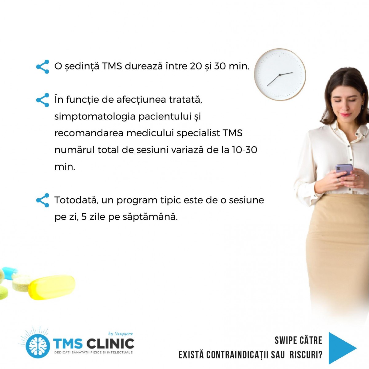 O ședință TMS durează între 15 și 30 minute. În funcție de afecțiune tratată numărul total de sesiuni variabile de la 10-30. Totodată, un program tipic este de o sesiune pe zi, 5 zile pe săptămână.