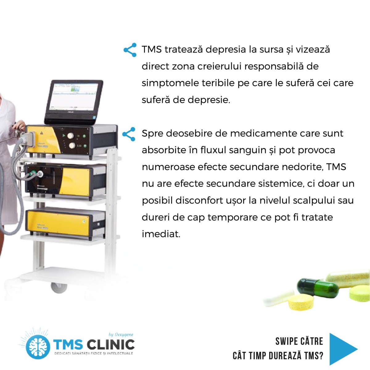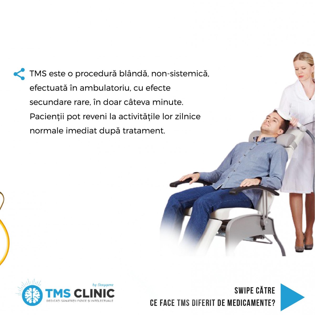 TMS este o procedură blândă, non-sistemică, în ambulatoriu, cu efect secundar rar și poate fi efectuat în doar câteva minute. Pacienții pot reveni la activitățile lor zilnice normale imediat după tratament.