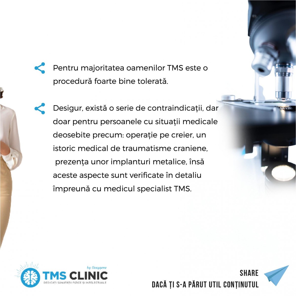 Așa cum am mai spus mai sus, pentru majoritatea oamenilor TMS este sau procedură foarte bine tolerată. Desigur, există o serie de contraindicații, dar doar pentru persoane cu situații medicale deosebite precum: operație pe creier sau un istoric medical cu traumatism craniene, epilepsie, însă aceste aspecte sunt verificate în detaliu împreună cu pacientul.