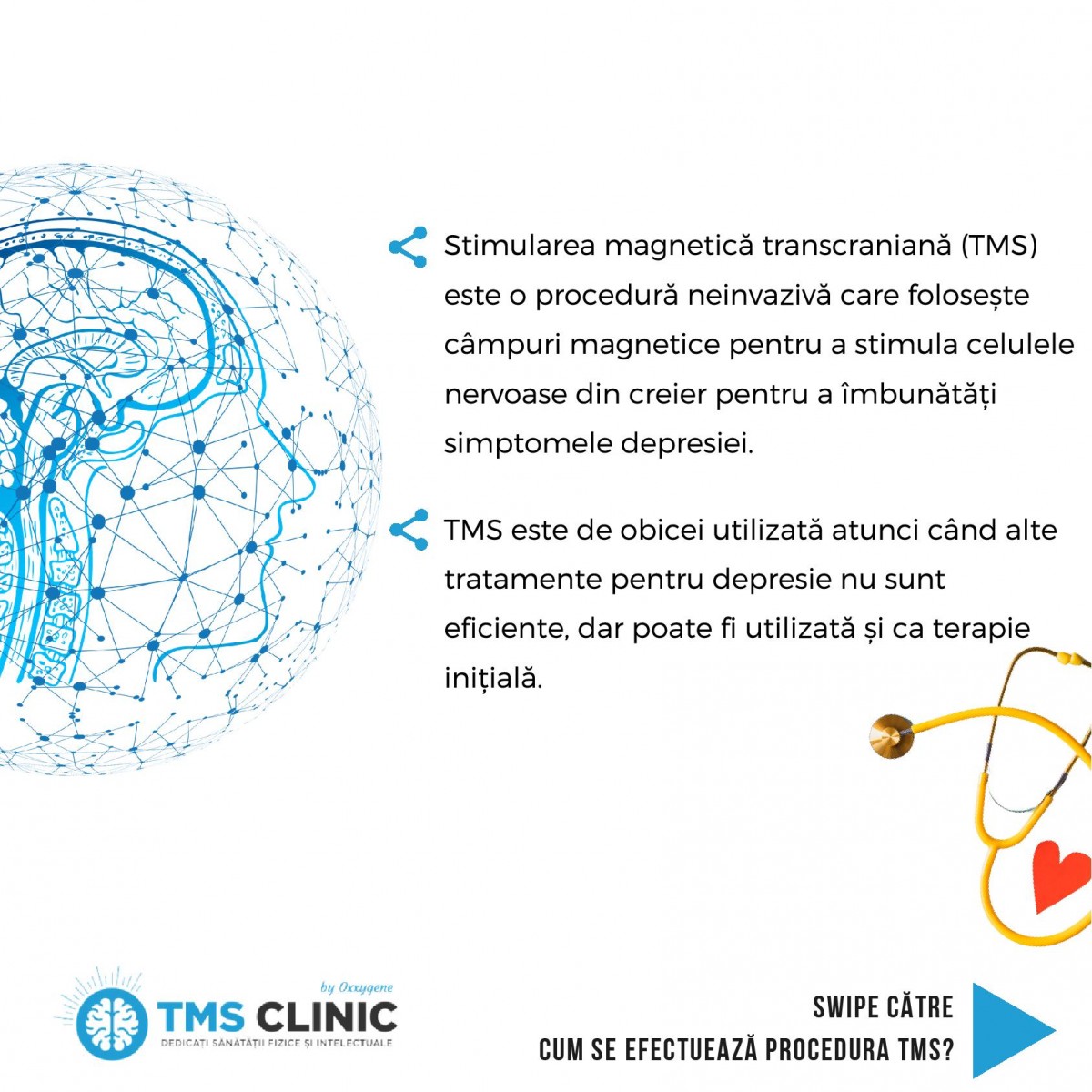 Stimularea magnetică transcraniană (TMS) este o procedură neinvazivă care folosește câmpuri magnetice pentru a stimula celulele nervoase din creier pentru a îmbunătăți simptomele depresiei. TMS este de obicei folosit atunci când alte tratamente pentru depresie nu mai sunt eficiente.